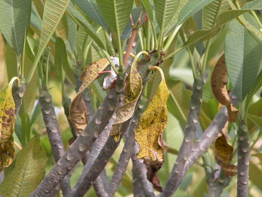 Frangipani rust (bright yellow or orange pustules) on the underside of mainly mature leaves caused by the fungus Coleosporium plumeriae (Fig. 21). The disease thrives in moist and humid conditions. With time, the areas infested with frangipani rust pustules turn into brown, necrotic areas which can be seen on both underside and upperside of leaf. The leaves with heavily damaged by Frangipani rust turn yellow/brown, dry, curl and prematurely fall. Spraying the tree with Triadimefon (Bayleton) can be used as a preventive control for Frangipani rust. However, it is not effective if the leaves are already severely infected with the rust.Suggested reading: Frangipani rust