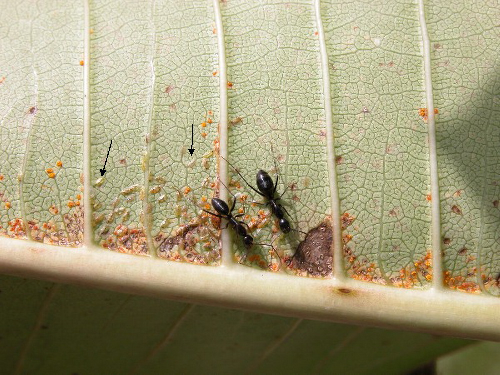 Figure 8. Ants farm scale insects on underside of a leaf (left), and scale insects on a plumeria seed pod (right).