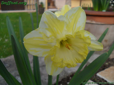 | Figure 2. Colour break in reverse bicolour Daffodil caused by Narcissus mosaic virus (Image credit to Marcello Pasini) |